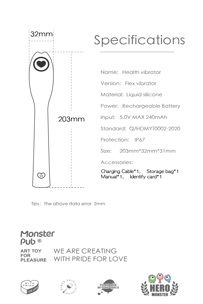 Um vibrador relativamente fino e com uma pequena cabeça monstruosa para fácil inserção, tanto anal quanto vaginal. São 8 padrões de vibrações massageadoras controladas pela tecla única do dispositivo ou por aplicativo no seu celular. Permita que o controle fique no seu dispositivo ou no celular de quem você deixar.